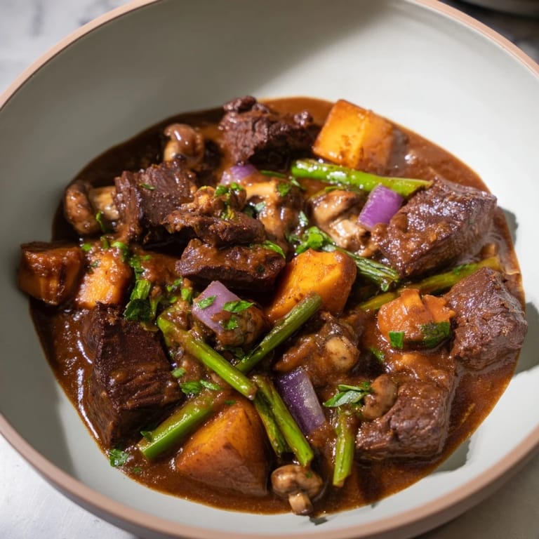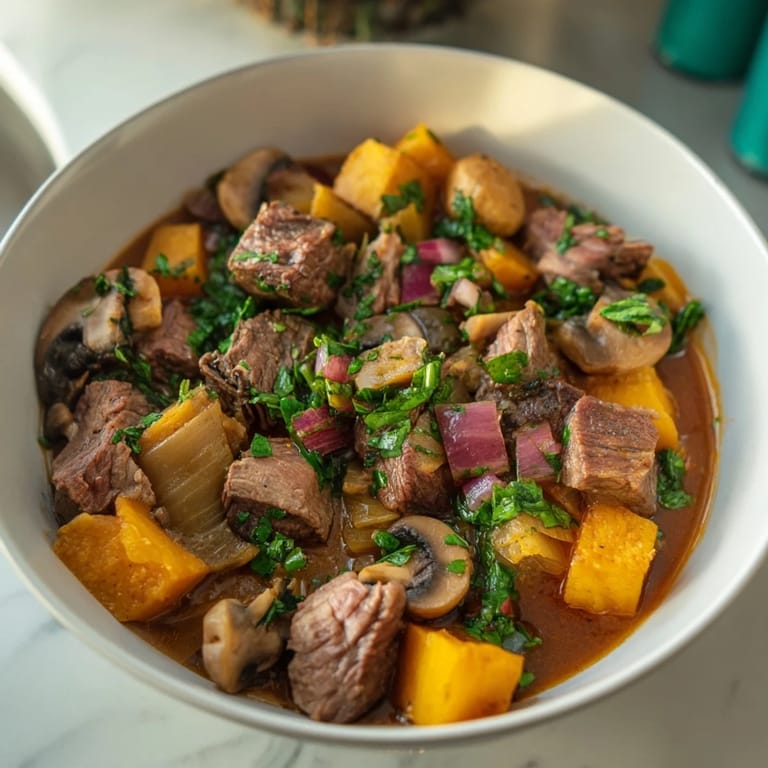 Save to Pinterest A hearty, rustic beef stew simmered with root vegetables, mushrooms, and herbs, served alongside a golden, crusty homemade bread – perfect for a comforting, cozy dinner.