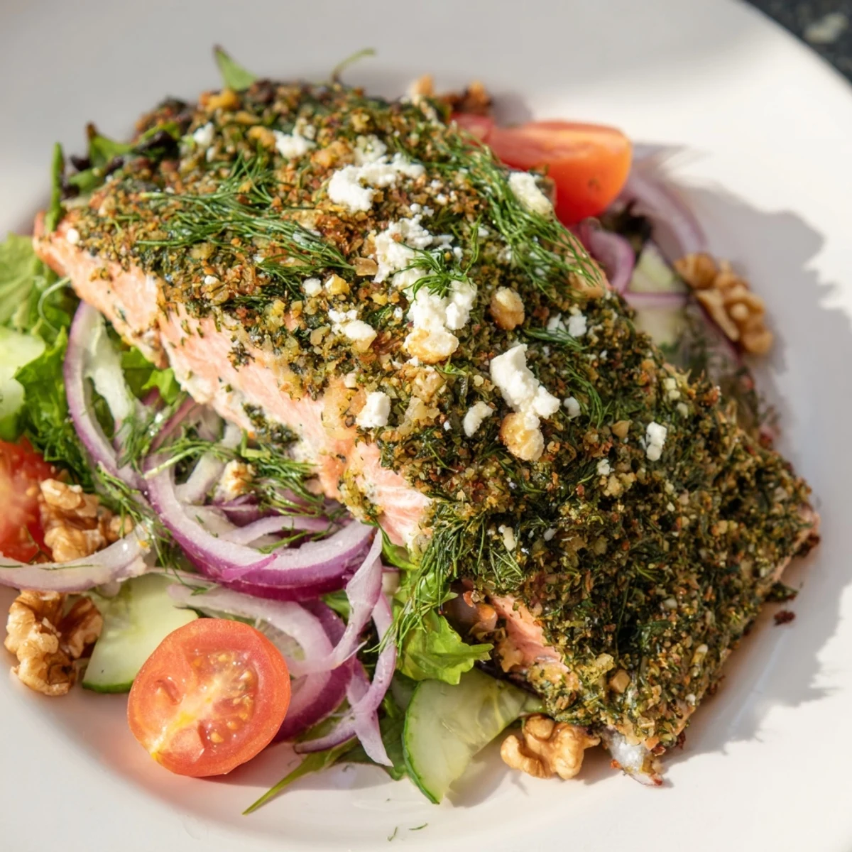 Save to Pinterest There's something about the way salmon catches the light as it comes out of the oven that makes you stop and just look at it for a moment. I discovered this particular combination on a Thursday evening when I had good greens in the crisper and salmon that needed cooking, and I wanted something that felt substantial but not heavy. The herbs formed this gorgeous golden crust, and when I plated it over the salad, my kitchen suddenly smelled like a restaurant. It became the kind of meal I started making whenever I needed to feel like I'd made something worth the effort.