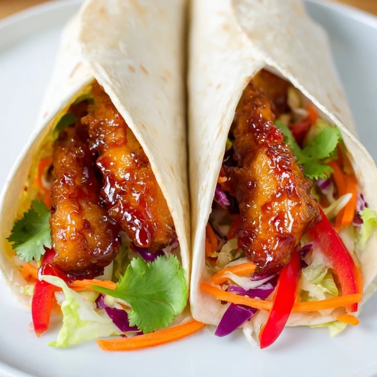 Swap the chicken for tofu or tempeh if you want it vegetarian, just press the tofu well and cook it until the edges crisp up before glazing. Add cucumber or shredded cabbage for extra crunch, or throw in some pickled jalapeños if you want more heat. If you dont have rice vinegar, lime juice works in a pinch and adds a brighter, more citrusy note. You can also turn this into a rice bowl instead of a wrap, and it feels like a completely different meal.