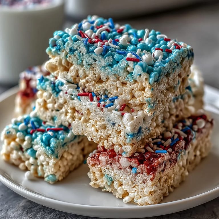 Save to Pinterest My neighbor knocked on my door last Fourth of July with a pan of these striped treats, and I couldn't stop eating them—something about the way the colors caught the light made them feel more special than regular Rice Krispies bars. The layers were so neat and intentional, like she'd planned a tiny flag out of marshmallows and cereal, and somehow that simple idea stuck with me. Now I make them every summer, and they've become the thing people actually ask for instead of the usual plate of cookies.
