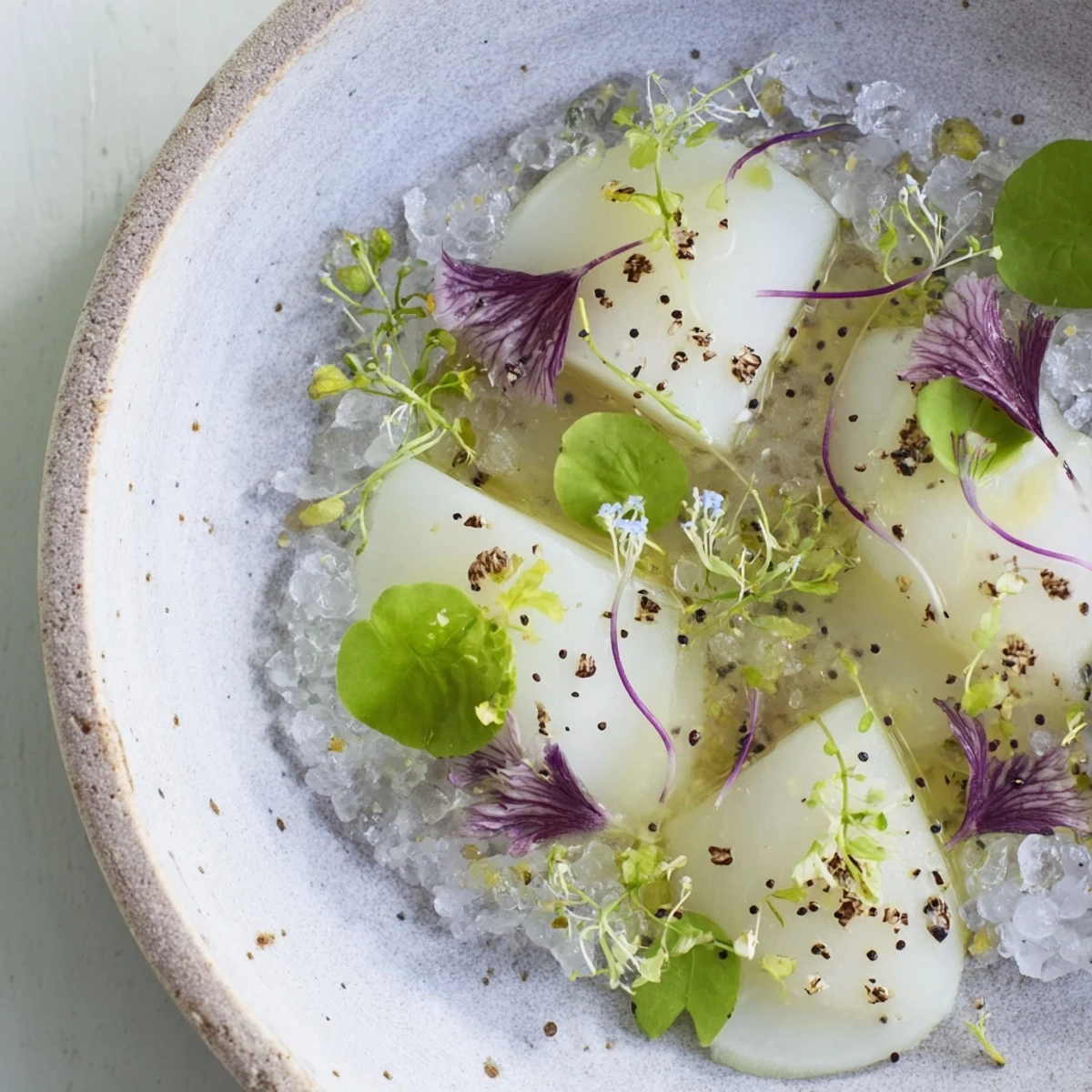 Save to Pinterest I discovered this dish on a particularly gray afternoon, scrolling through photos of Iceland's barren landscape and feeling restless in my kitchen. Something about the stark, colorless beauty of tundra made me want to cook with the same visual philosophy—taking the simplest, palest ingredients and arranging them like nature's own art installation. The first time I plated it on a chilled stone, watching how the white sesame seeds caught the light against pale daikon slices, I realized I'd stumbled onto something that felt less like dinner and more like edible minimalism.